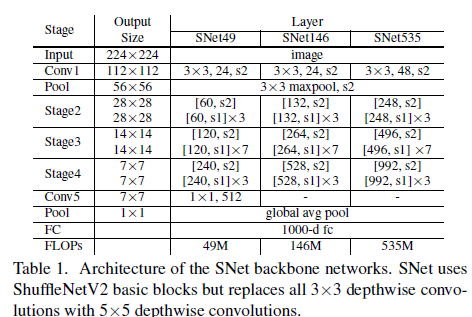 SNet49, SNet535, SNet146 세가지 모델을 실험.